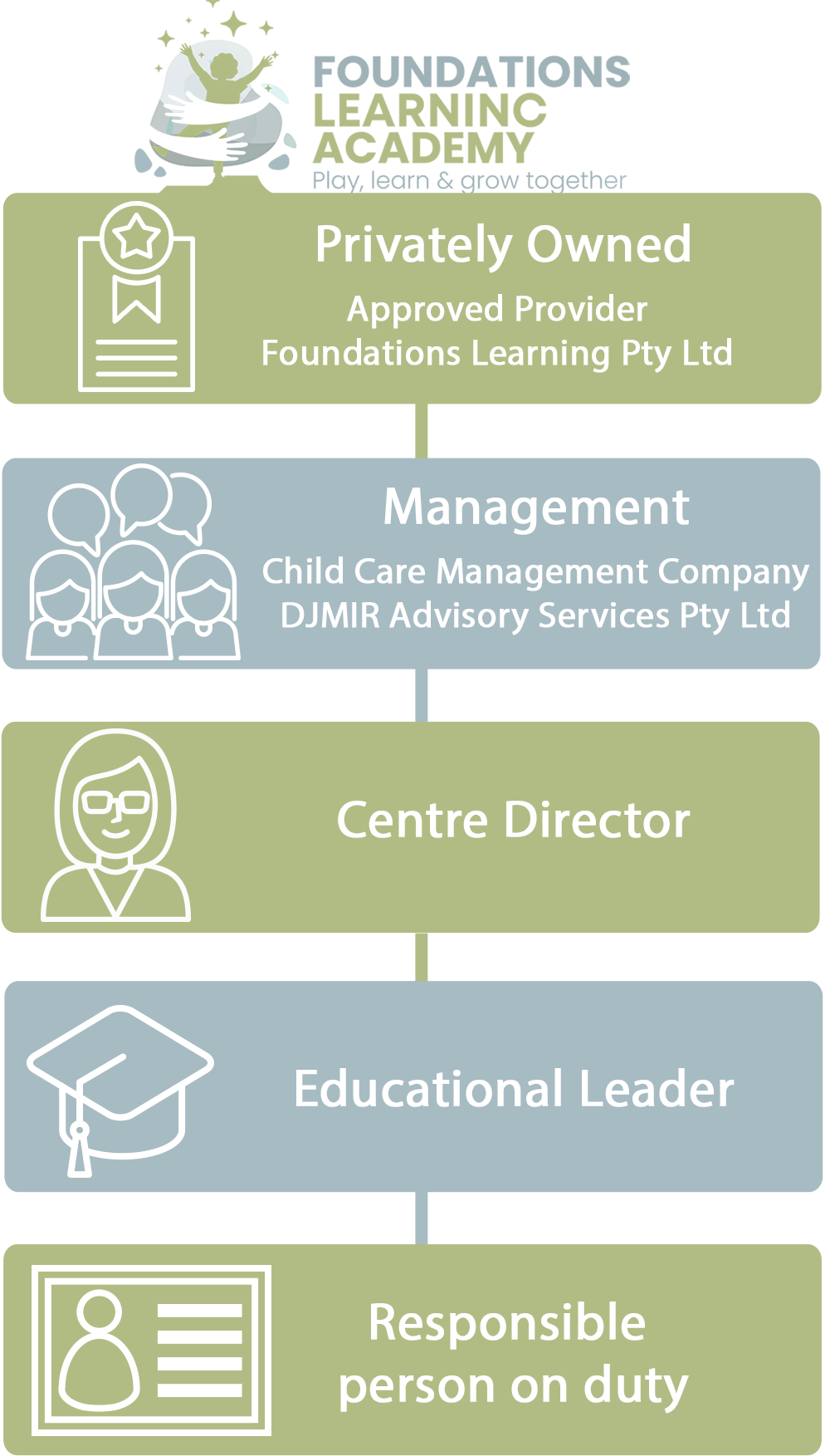 Foundations Learning Academy is a privately owned centre that is managed by a professional child care management team, to ensure our families and their children receive the highest standard of quality care and early education.